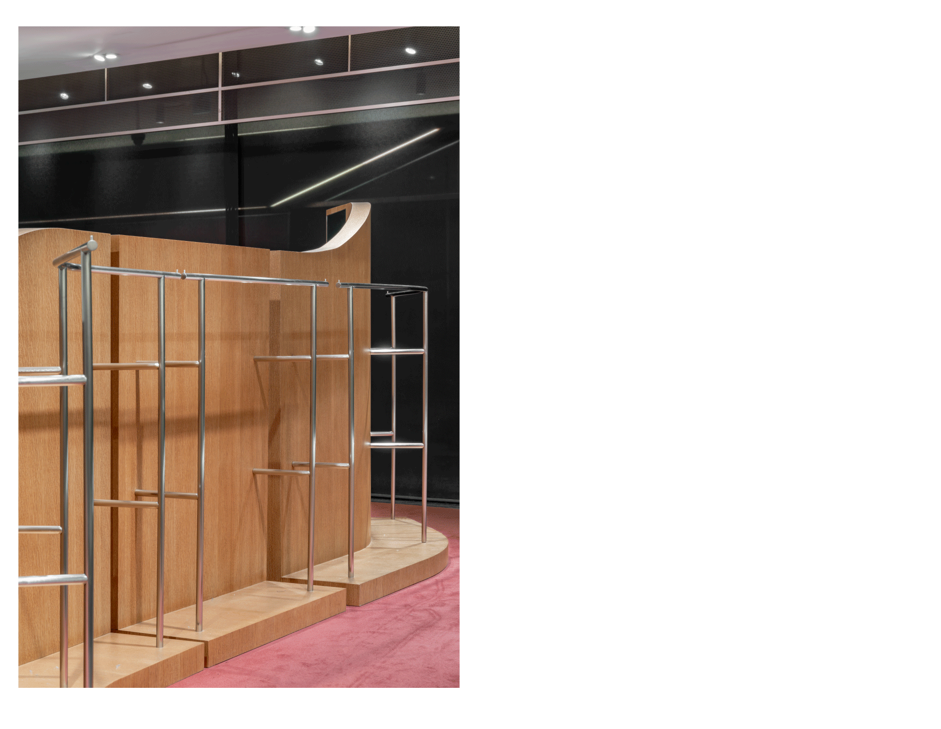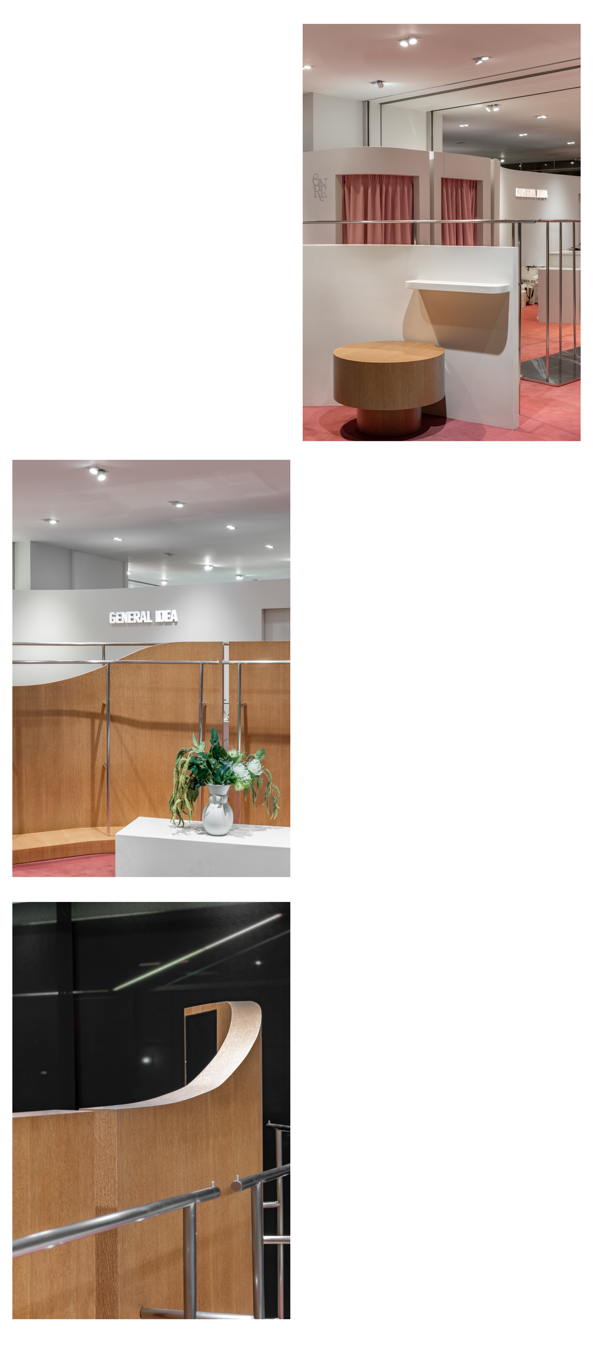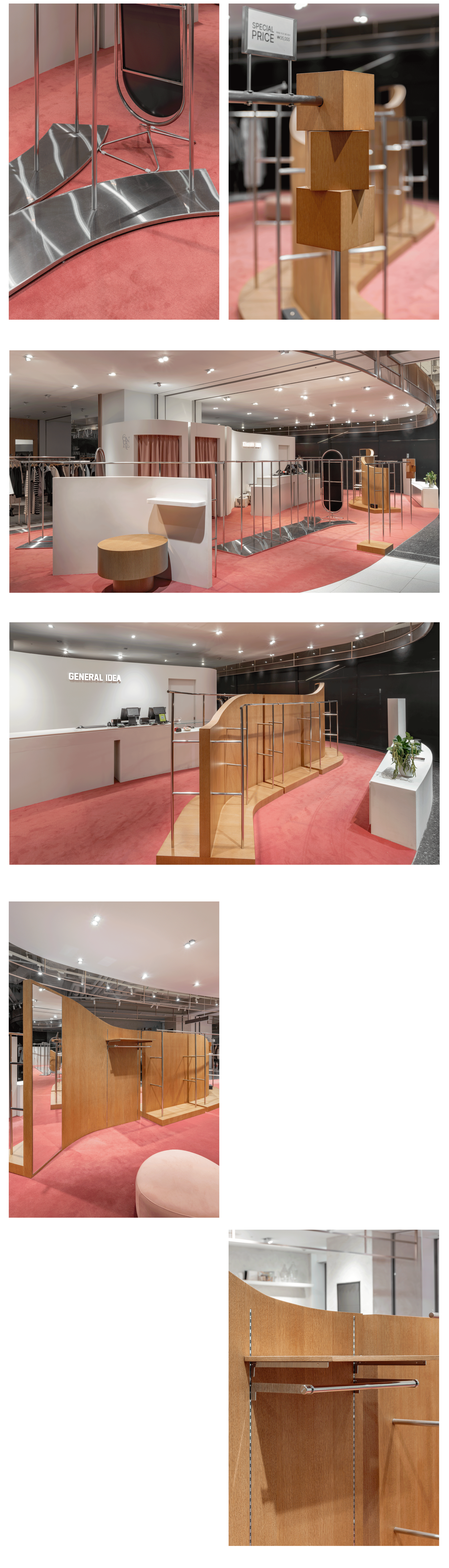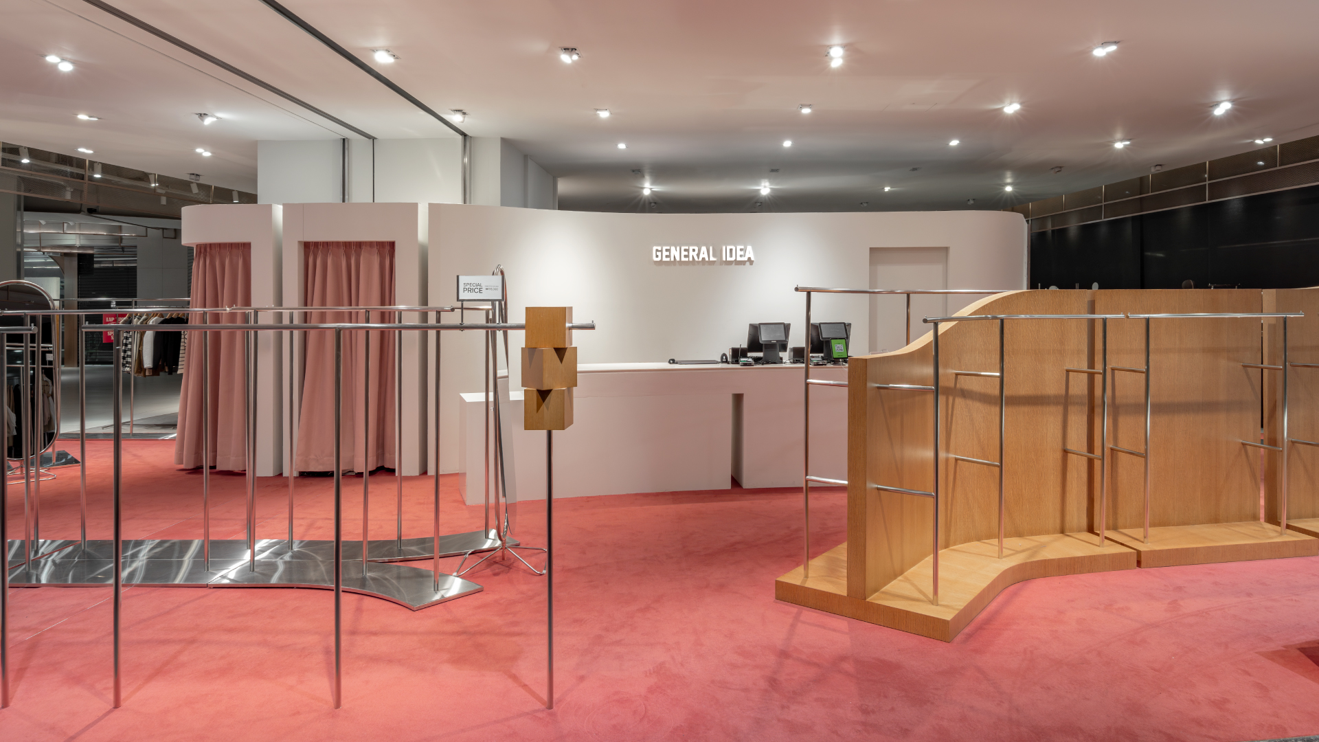 The new GENERAL IDEA store showcases a bold spatial shift. Bright-toned carpet flooring unseen in previous locations sets the tone, while organically shaped fixtures create a distinctive retail atmosphere.