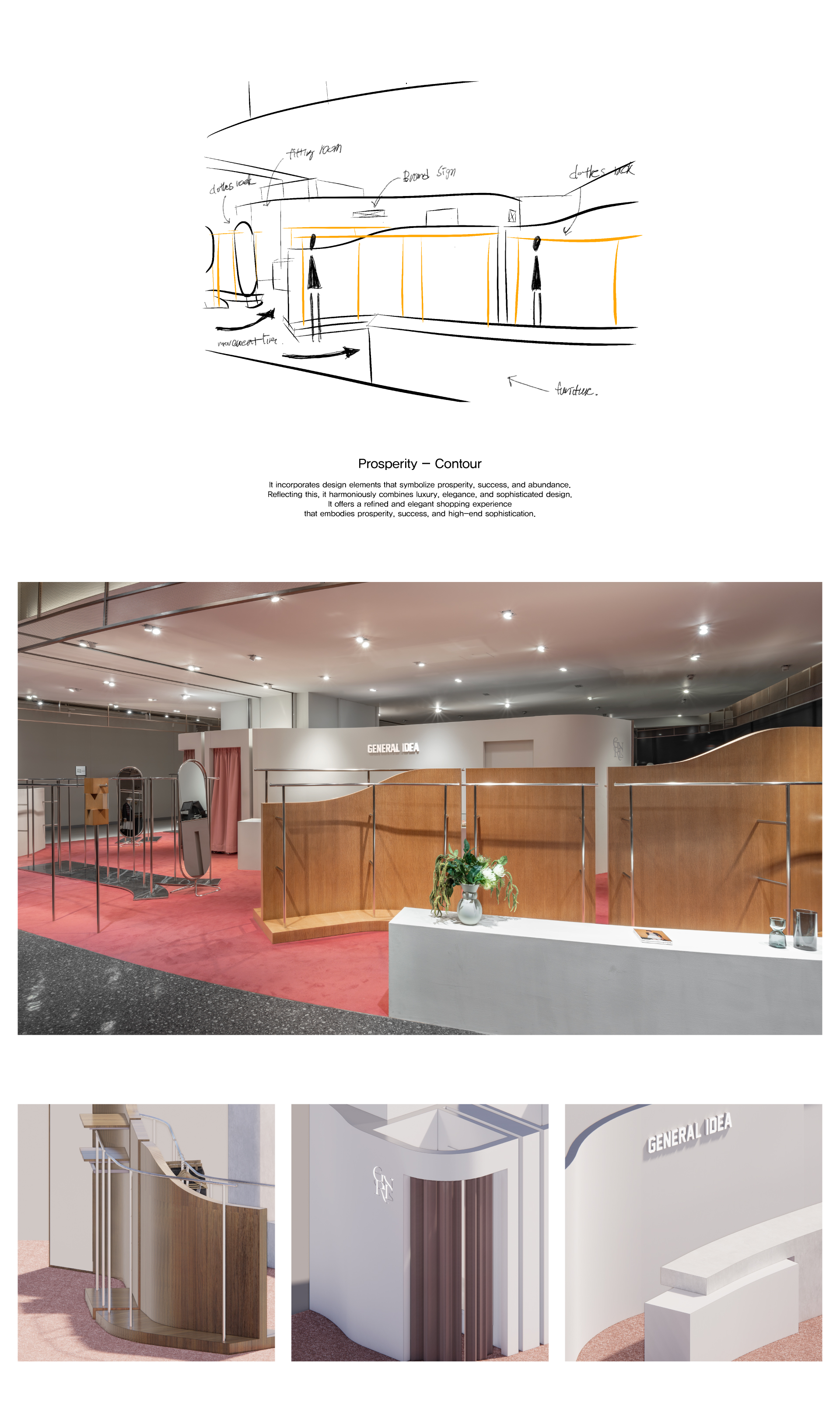 제너럴 아이디어의 용산 아이파크몰 매장의 공간 디자인을 진행했습니다. 제너럴 아이디어의 S.I 키 컨셉인 ’유기적 형태‘를 매장 중심에 배치하여, 다양한 방향에서 진입하는 고객들이 자연스럽고 계획적인 동선을 경험할 수 있도록 설계하였습니다.