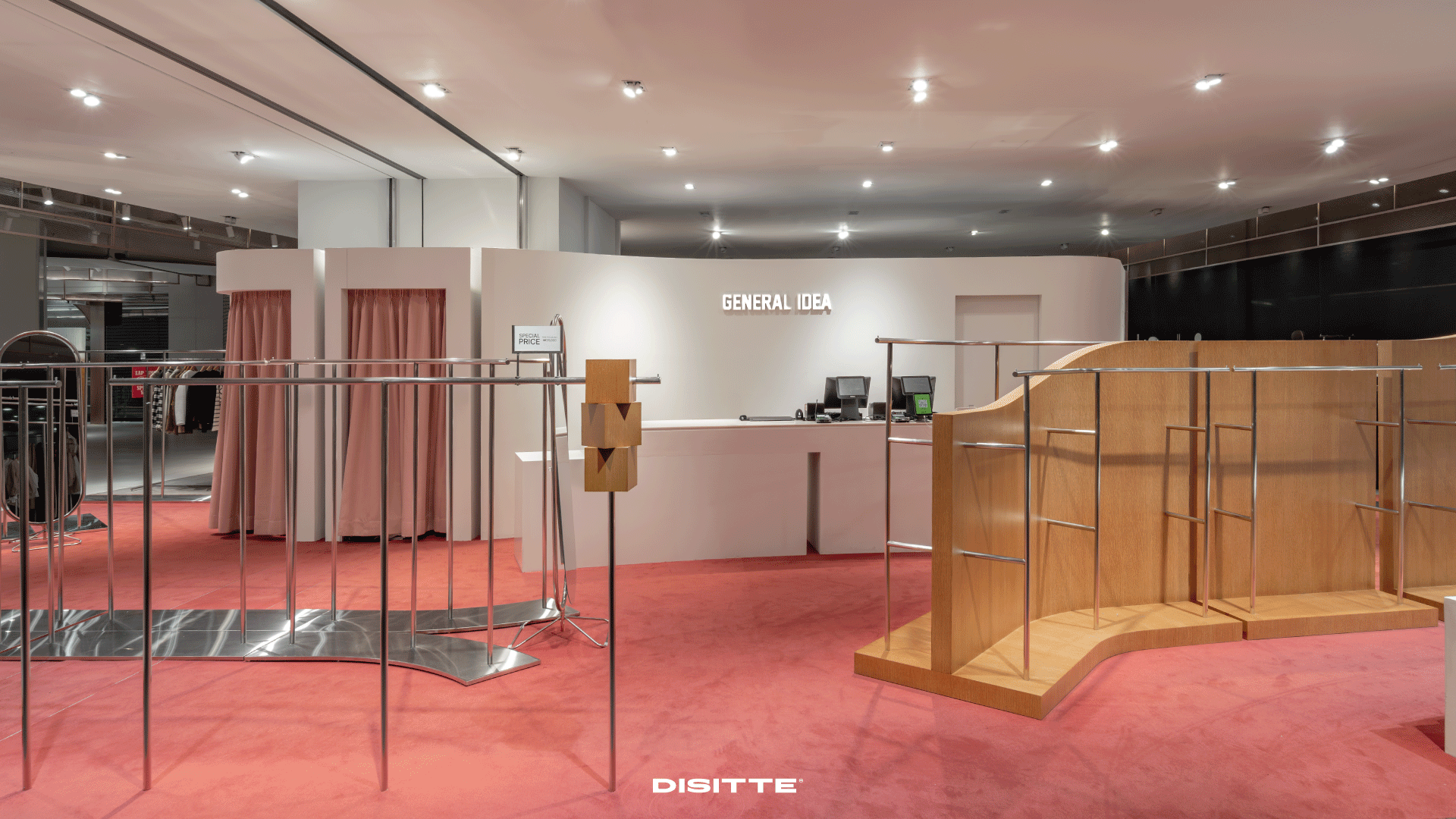 DISITTE has completed the spatial design for fashion brand GENERAL IDEA’s store at Yongsan I‘Park Mall. Central to the store’s layout is the brand’s S.I key concept ’Organic Form,‘ strategically situated in the heart of the space, ensuring visitors follow intentionally crafted pathways from any entrance.