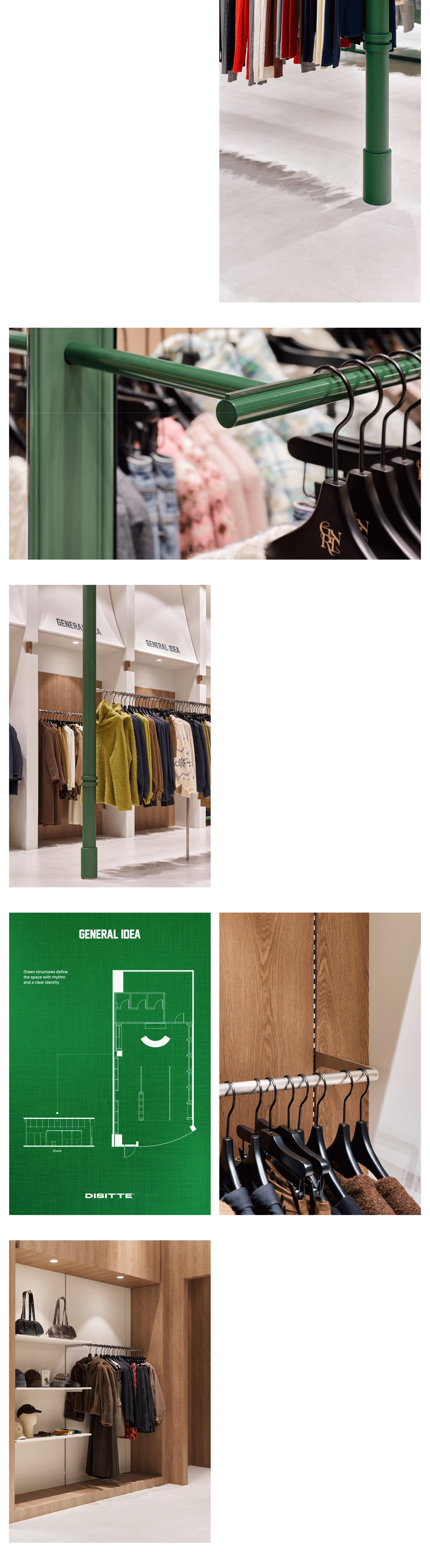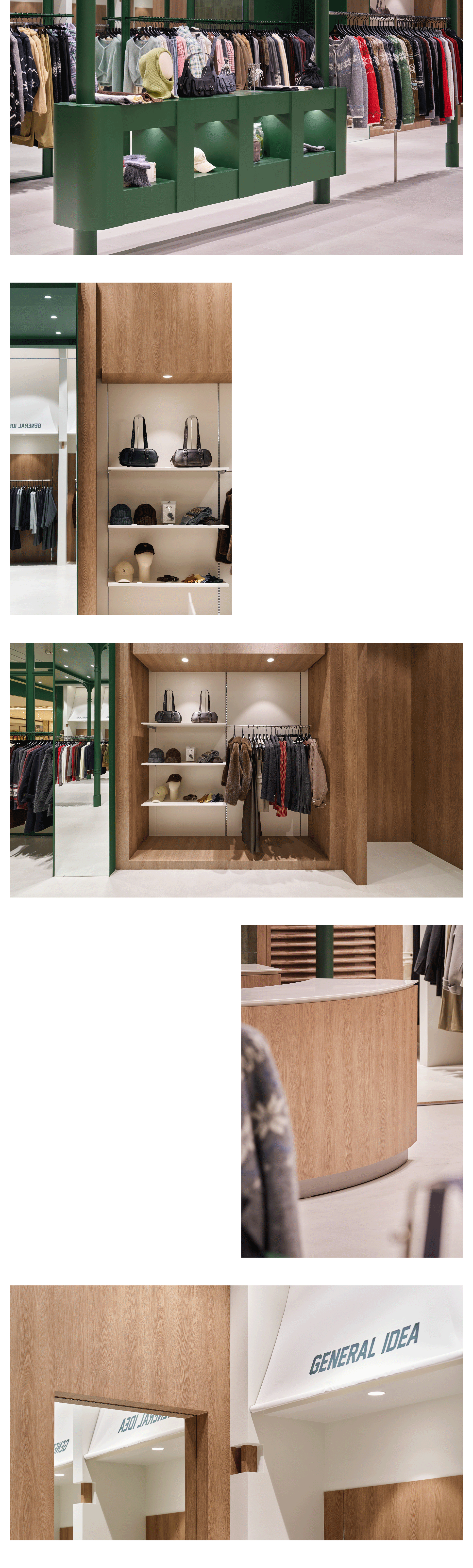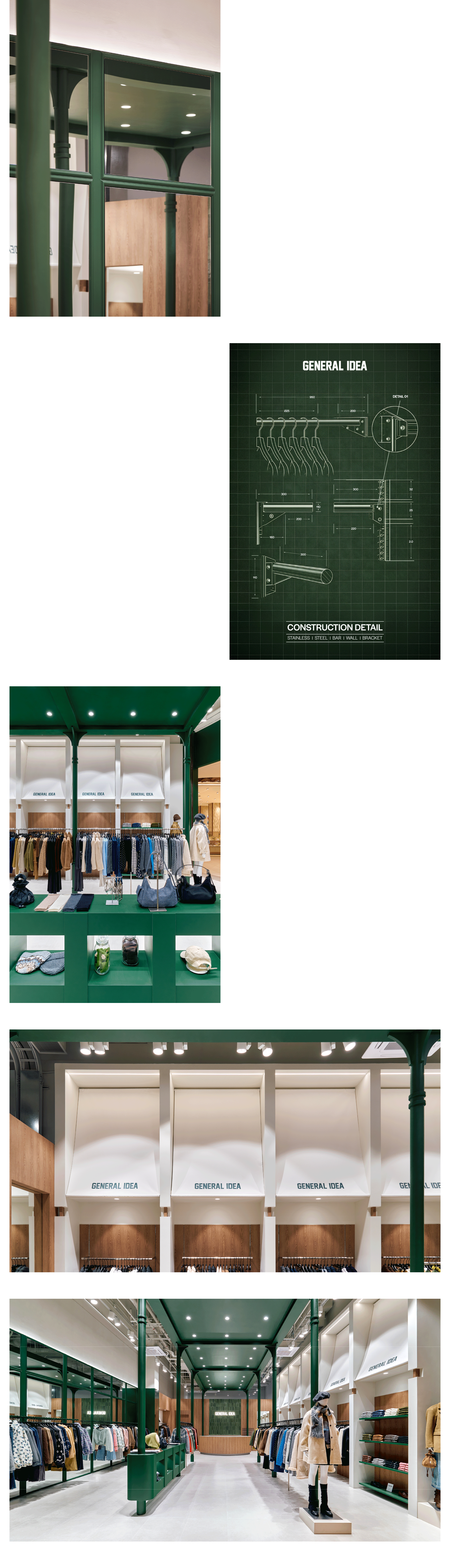 그린 프레임과 화이트 모티프를 반복해 매장 안에 리듬감 있는 장면을 만들었습니다. 기둥이 가지고 있는 디테일과 우드 소재의 온도를 더해 브랜드의 클래식한 인상이 자연스럽게 느껴지도록 구성했습니다.