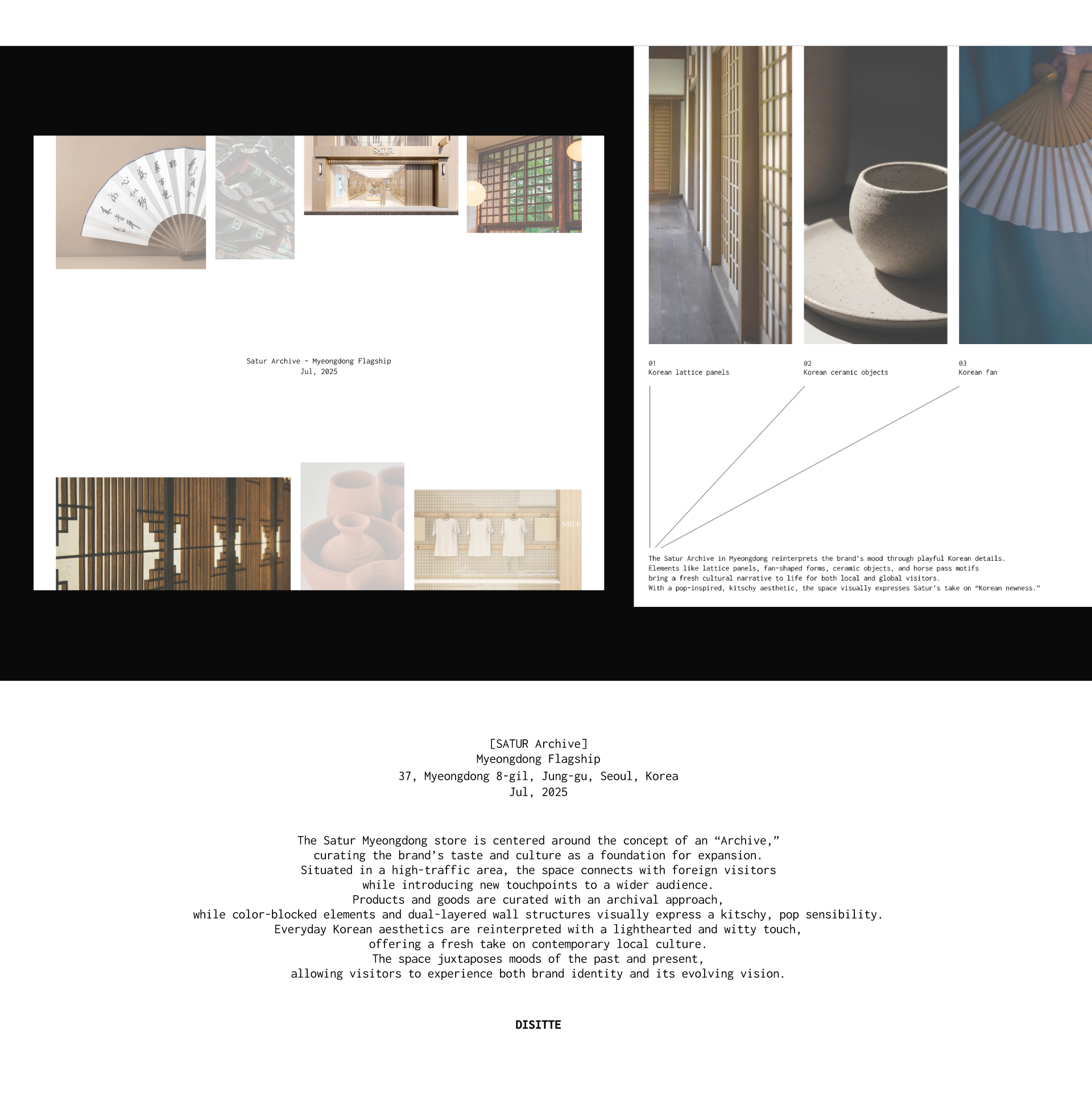아카이브적 구성은 브랜드의 굿즈와 콘텐츠를 중심으로 큐레이션되며, 컬러 블록과 이중 벽면 구조는 키치하고 팝적인 정서를 시각화합니다. 국내의 일상적 감수성을 가볍고 위트 있게 표현한 소재와 오브제는 브랜드가 지향하는 ‘한국적인 새로움’을 보여줍니다. 공간 전체는 과거와 현재의 무드를 나란히 배치하며, 브랜드의 정체성과 미래 지향성을 동시에 경험할 수 있도록 설계되었습니다.